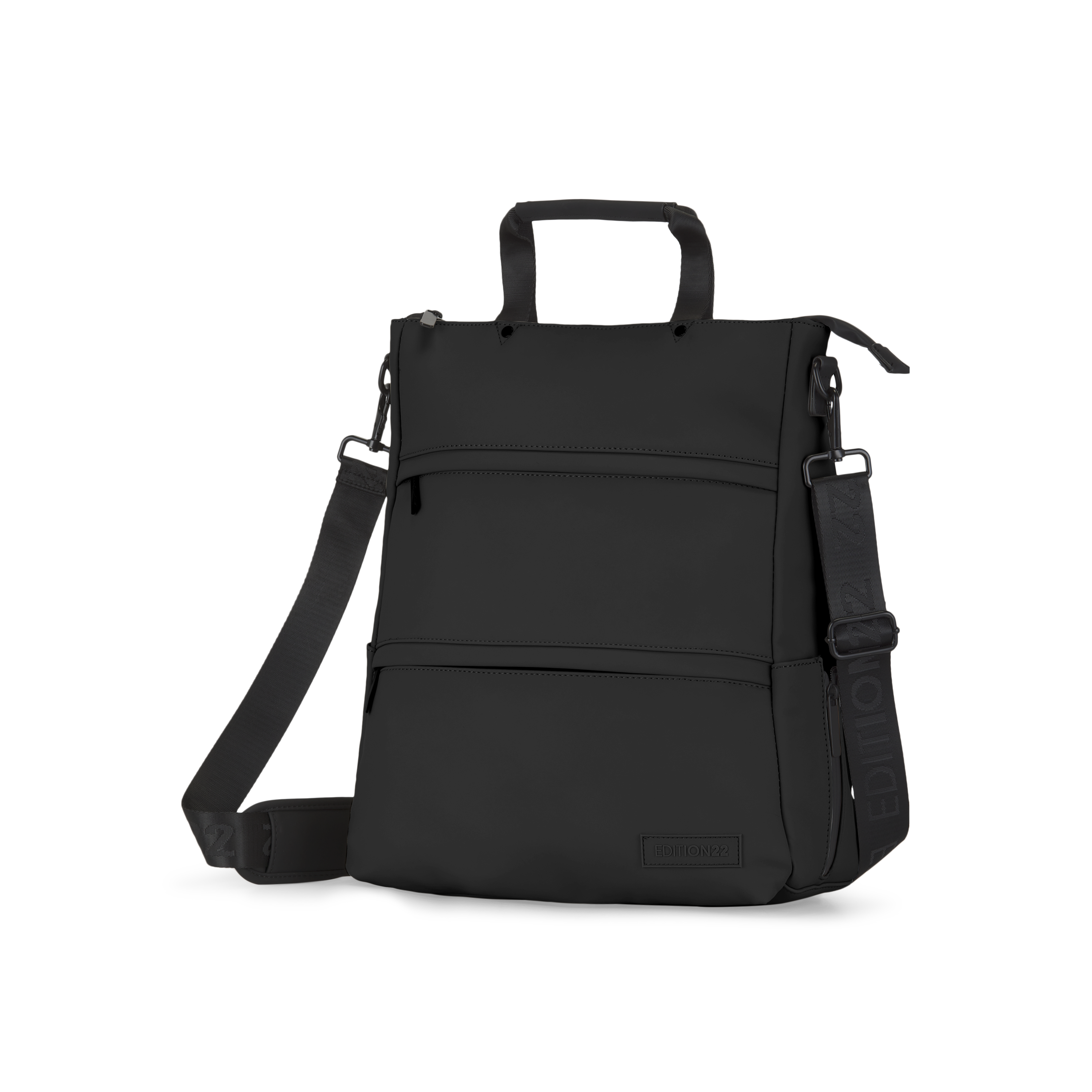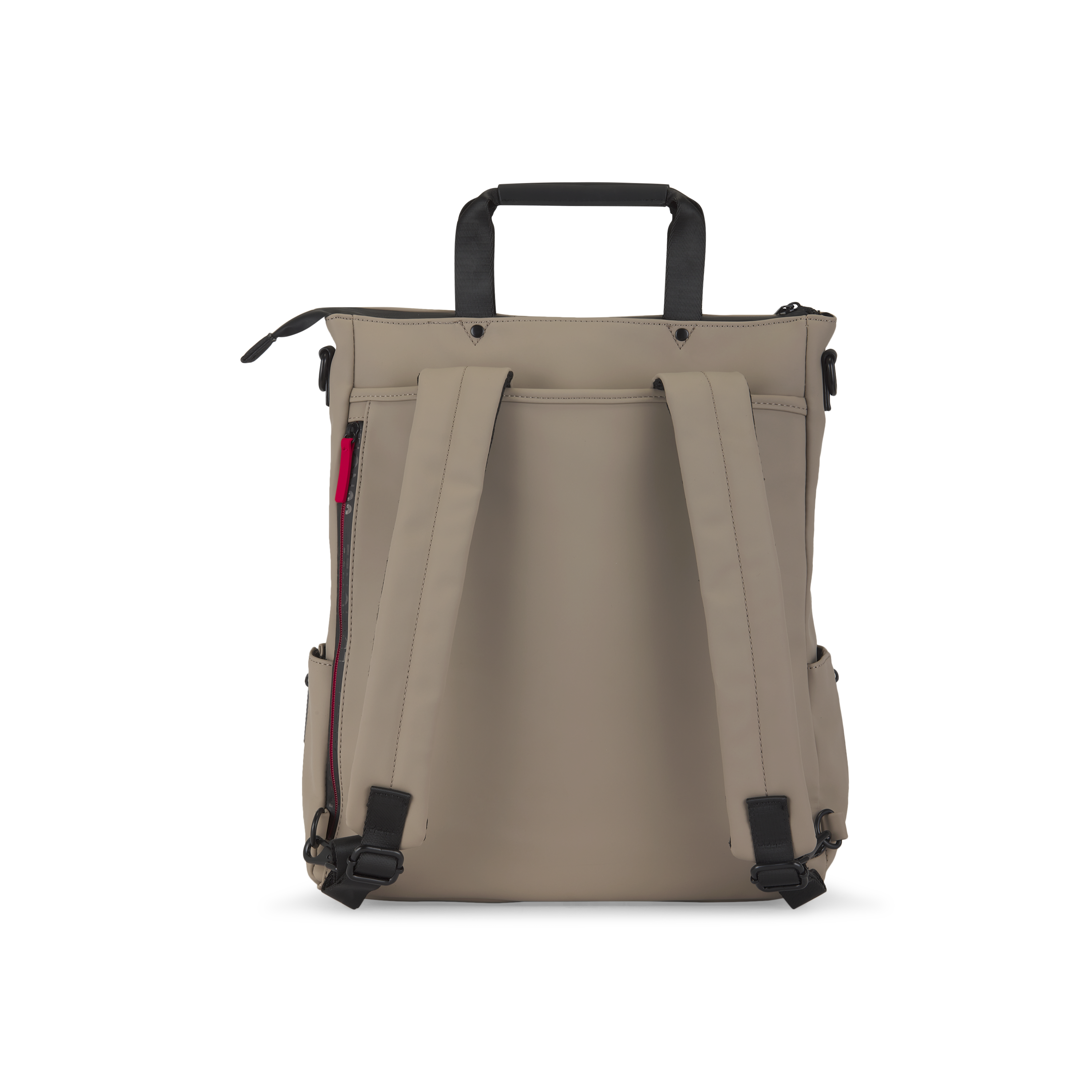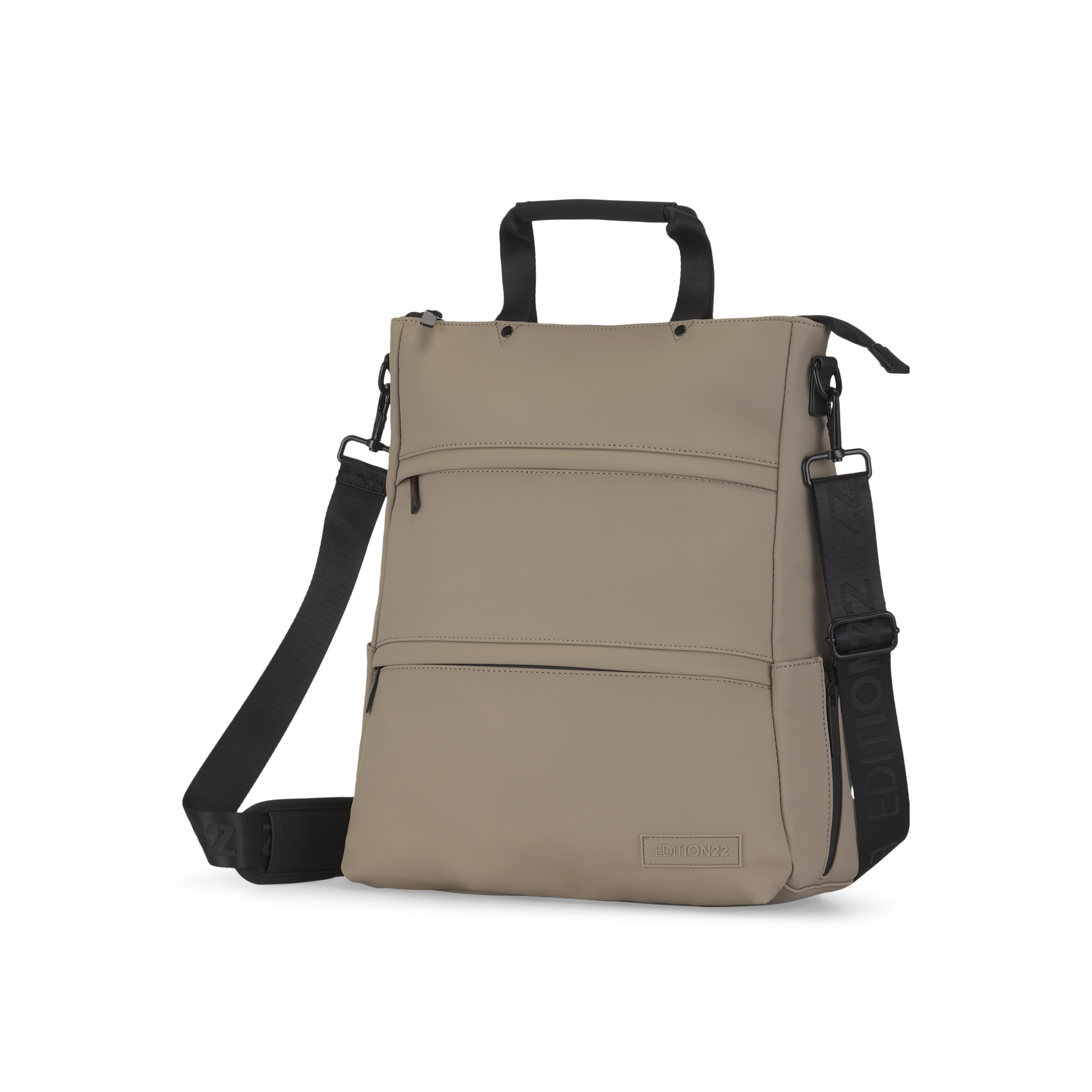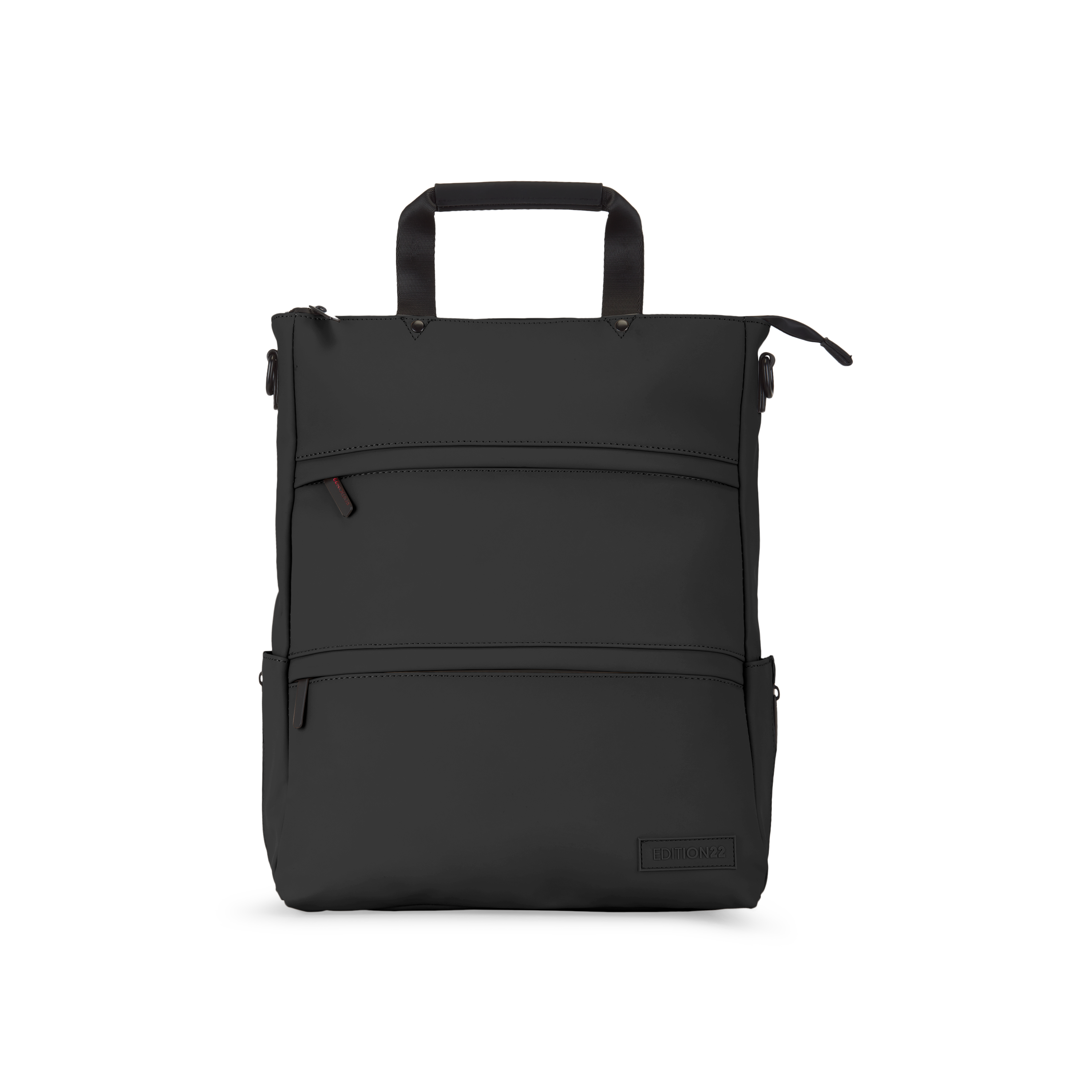 The Nomadic Tote is a stylish and versatile bag designed for individuals on the go. It is made with weather-resistant rubberized vegan leather, ensuring durability and protection against various weather conditions.