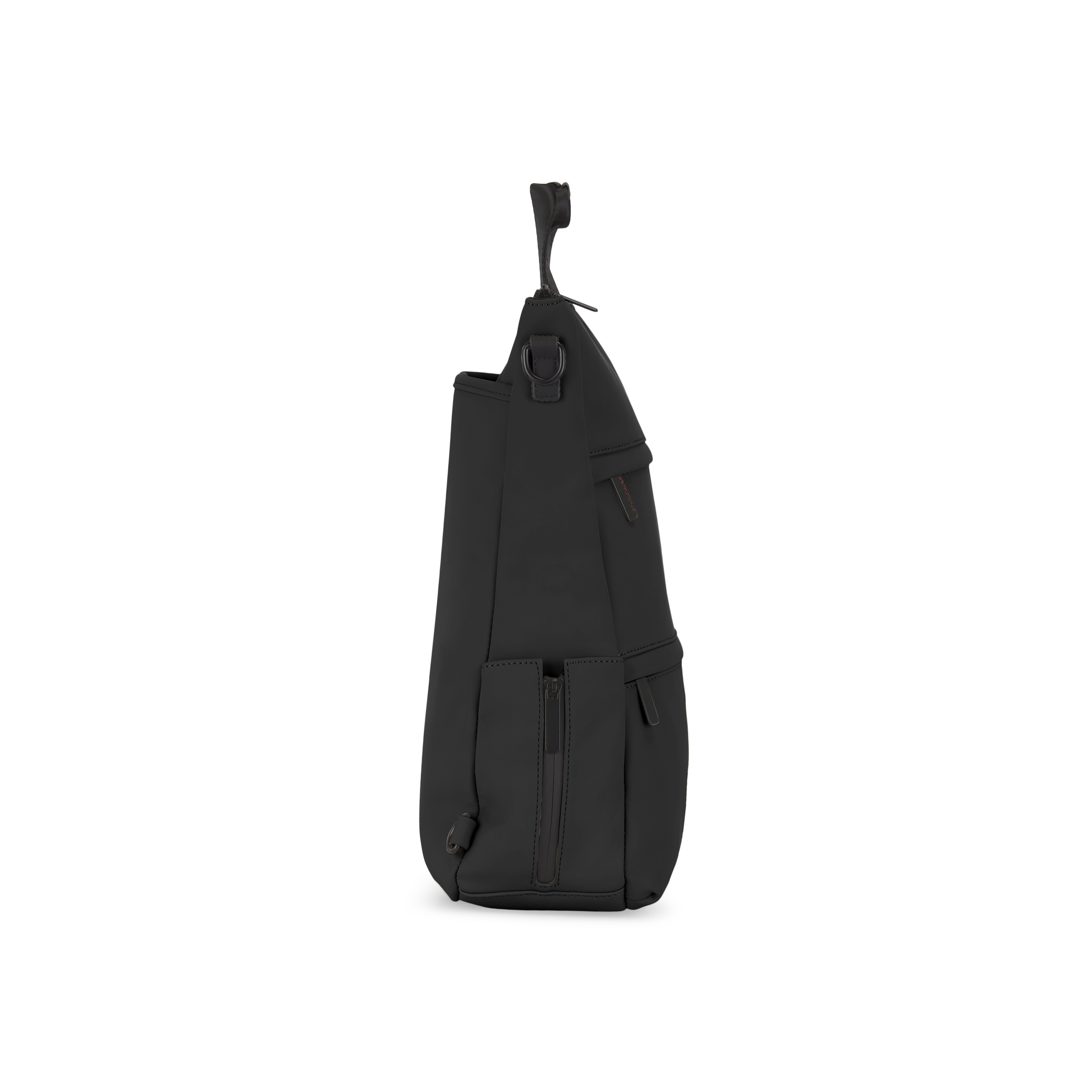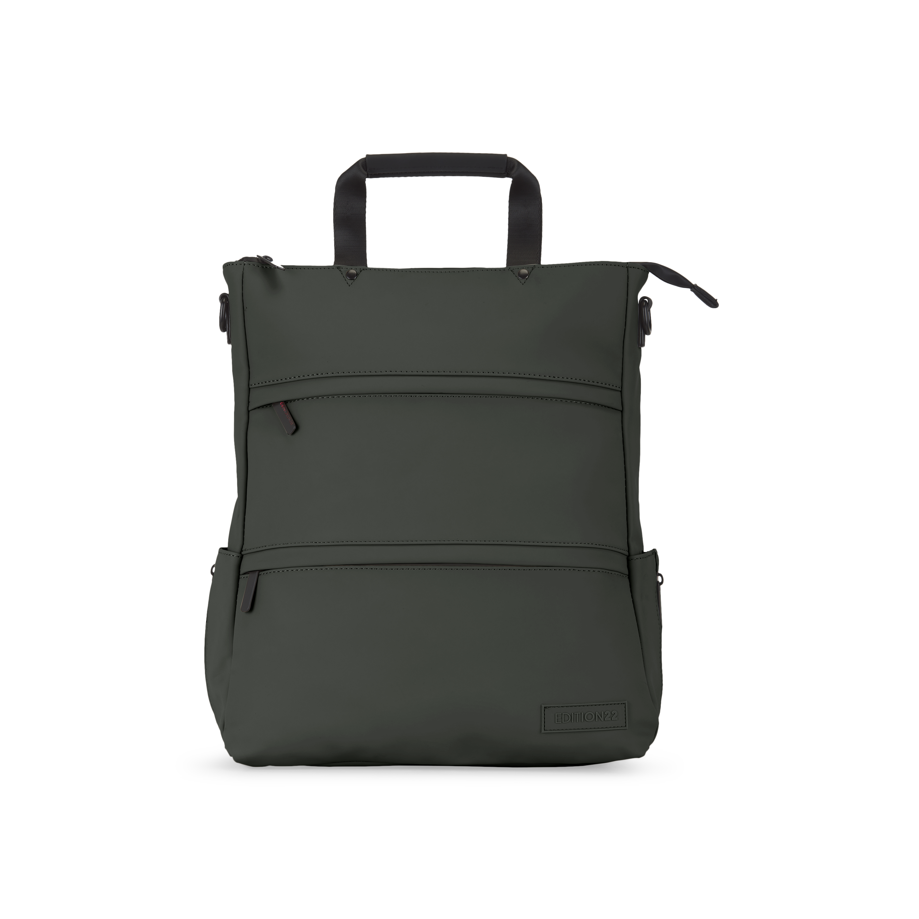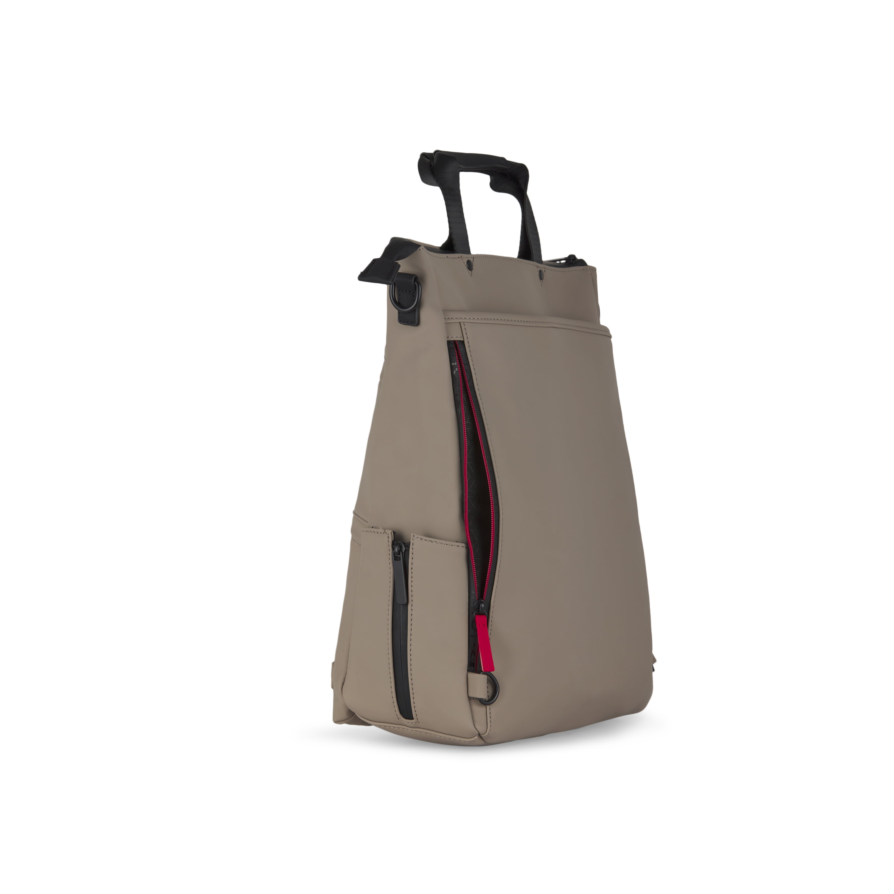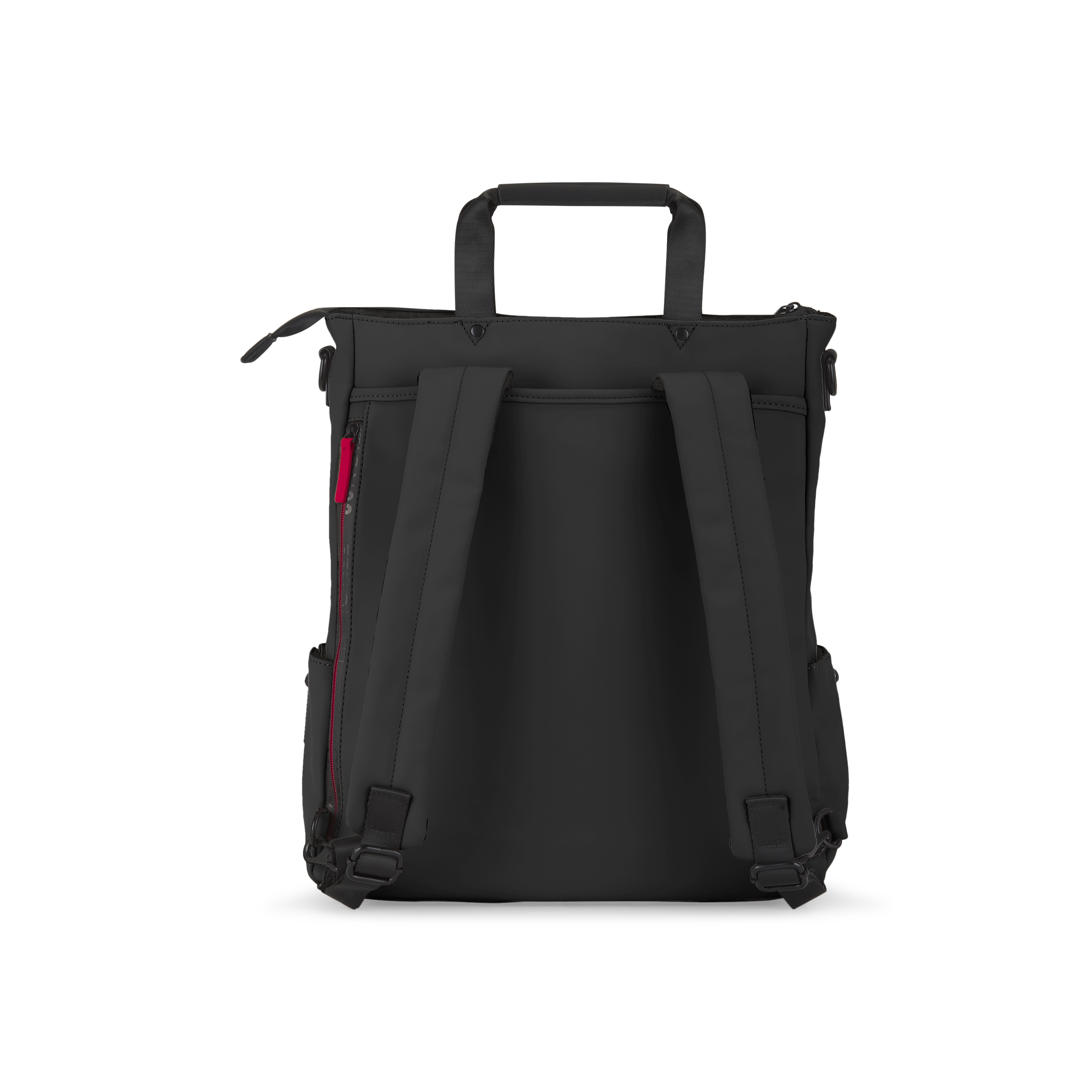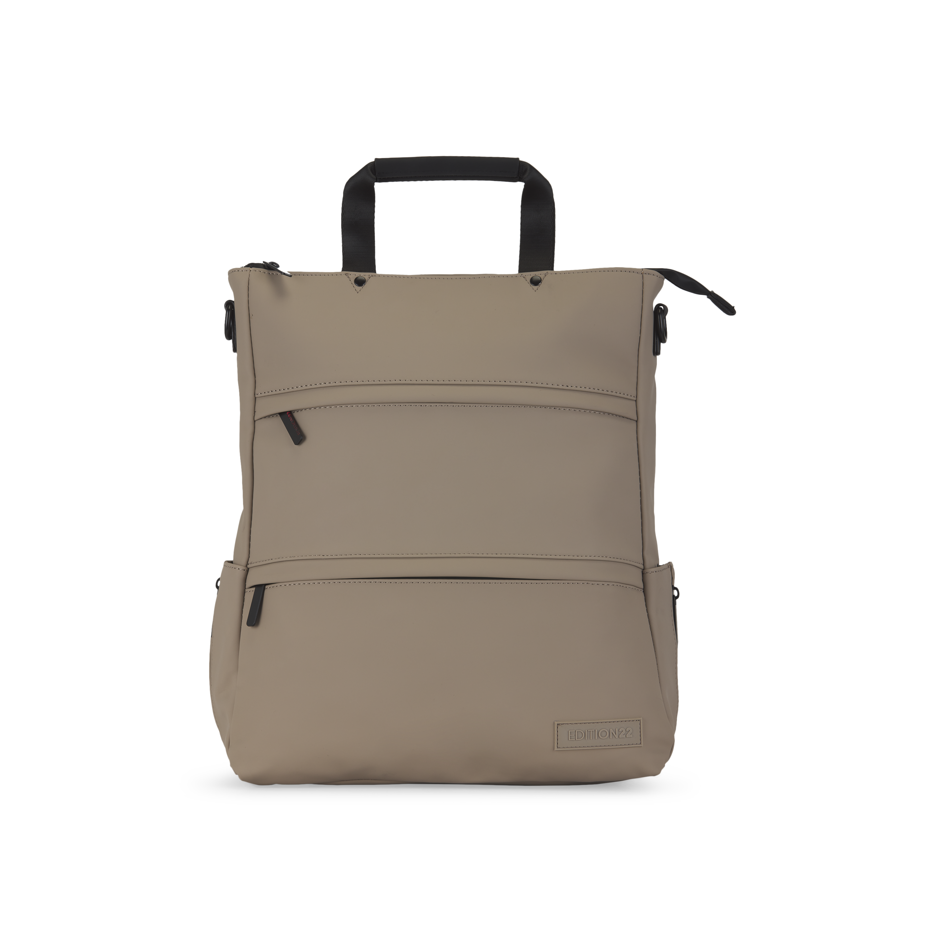 The Nomadic Tote is a stylish and versatile bag designed for individuals on the go. It is made with weather-resistant rubberized vegan leather, ensuring durability and protection against various weather conditions.