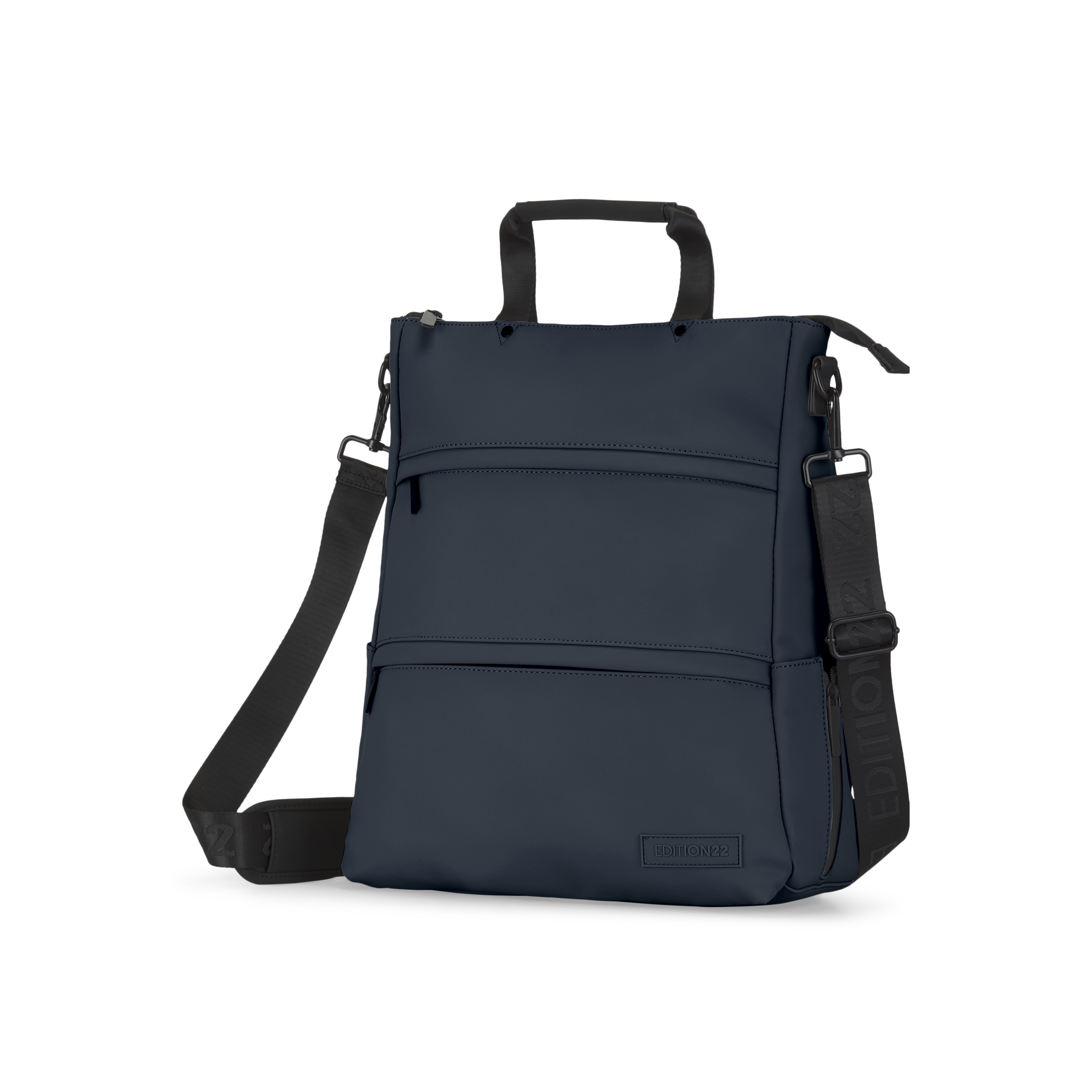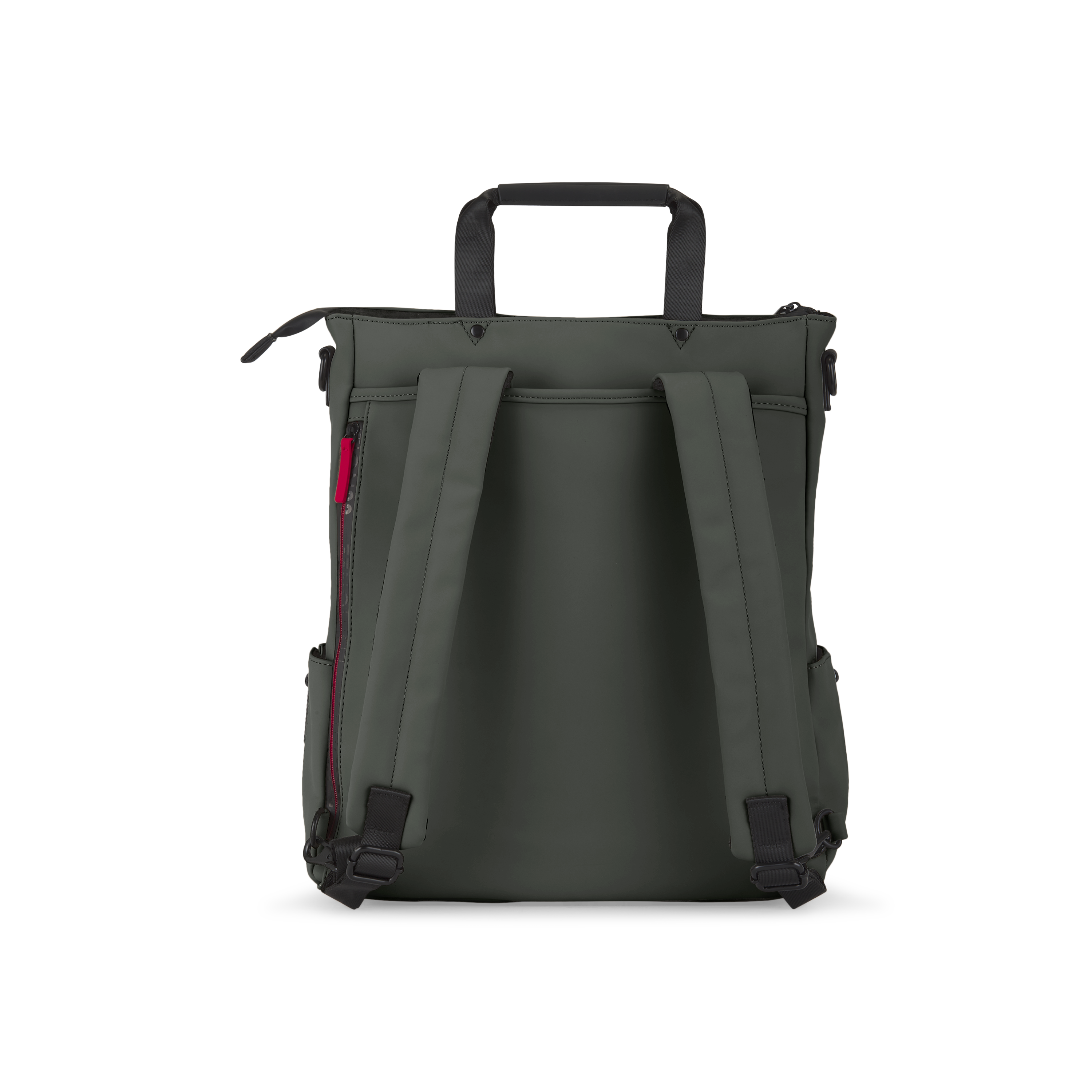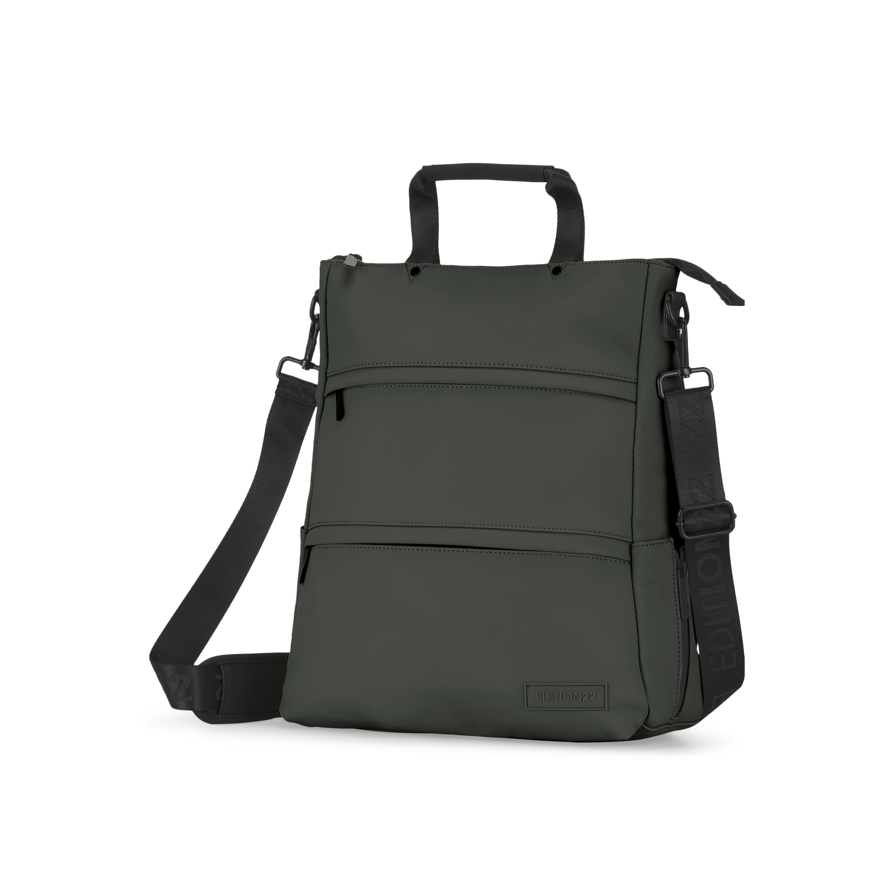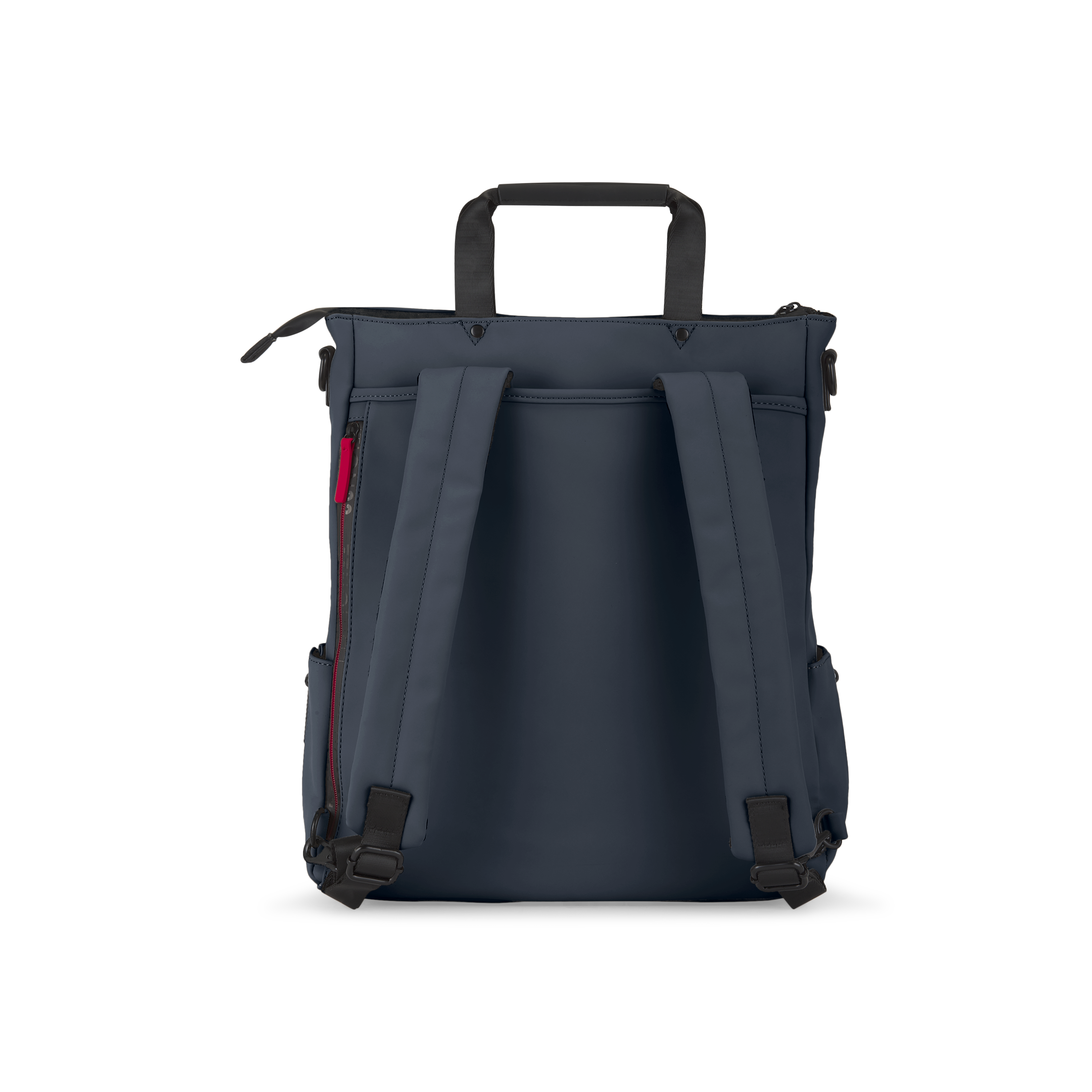 The Nomadic Tote is a stylish and versatile bag designed for individuals on the go. It is made with weather-resistant rubberized vegan leather, ensuring durability and protection against various weather conditions.
