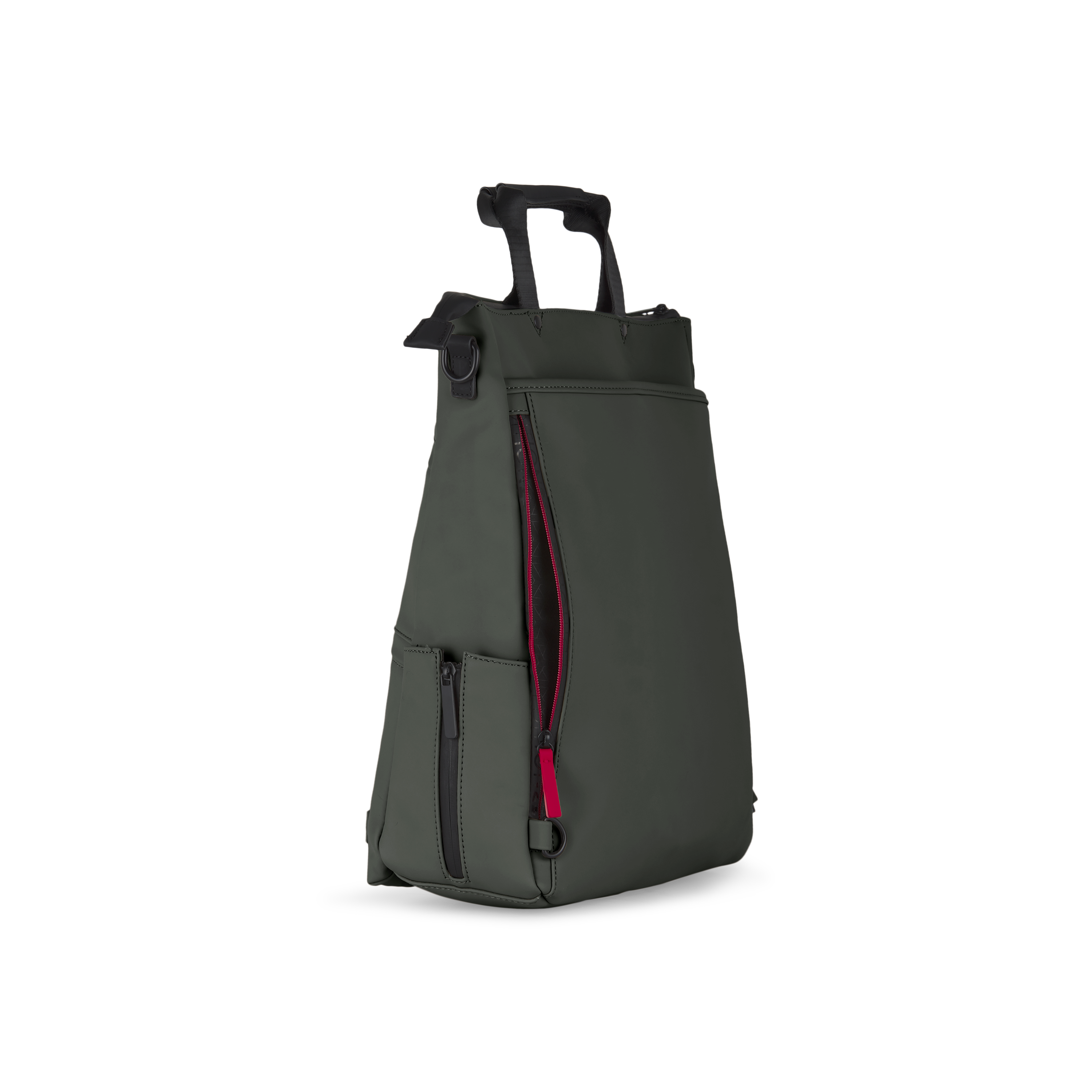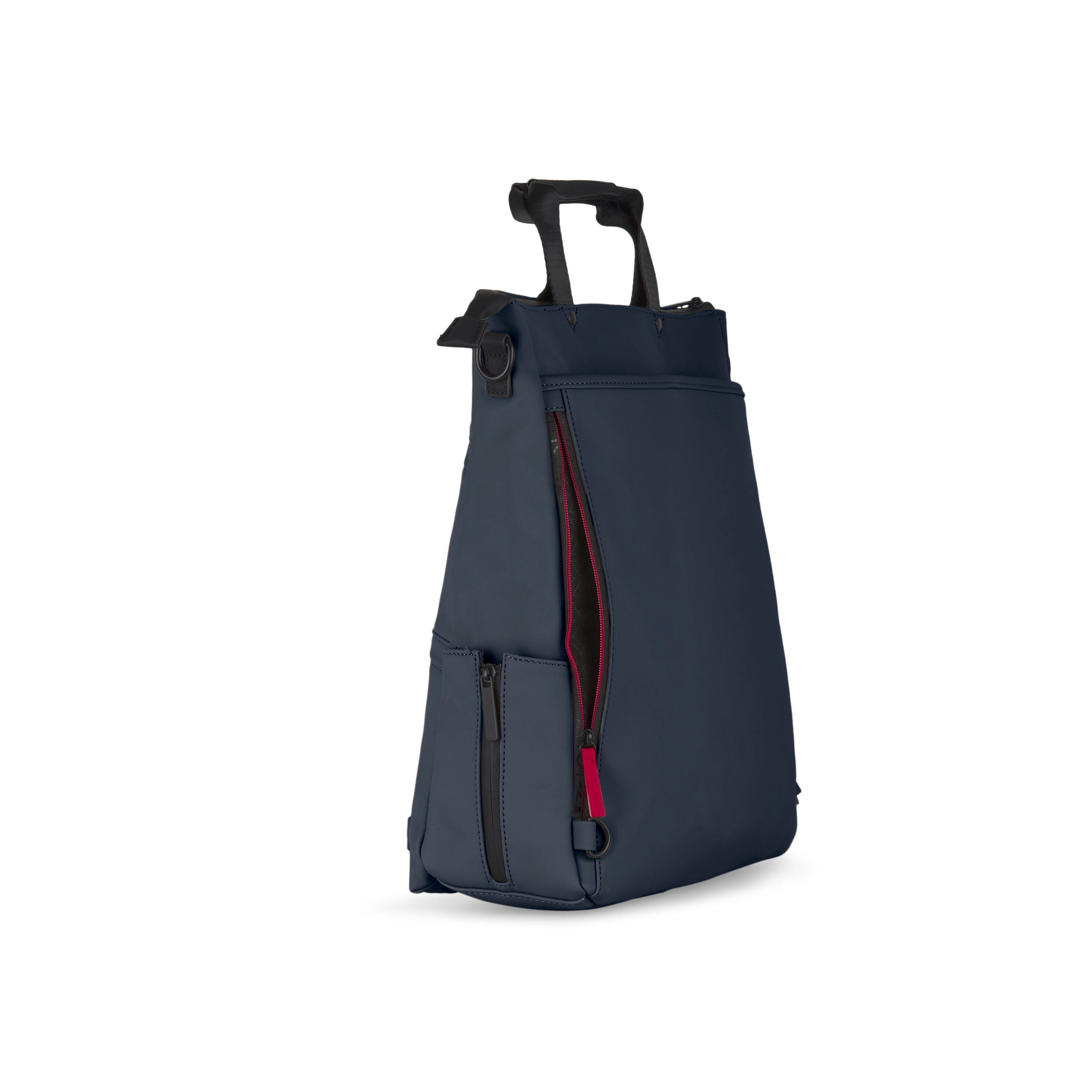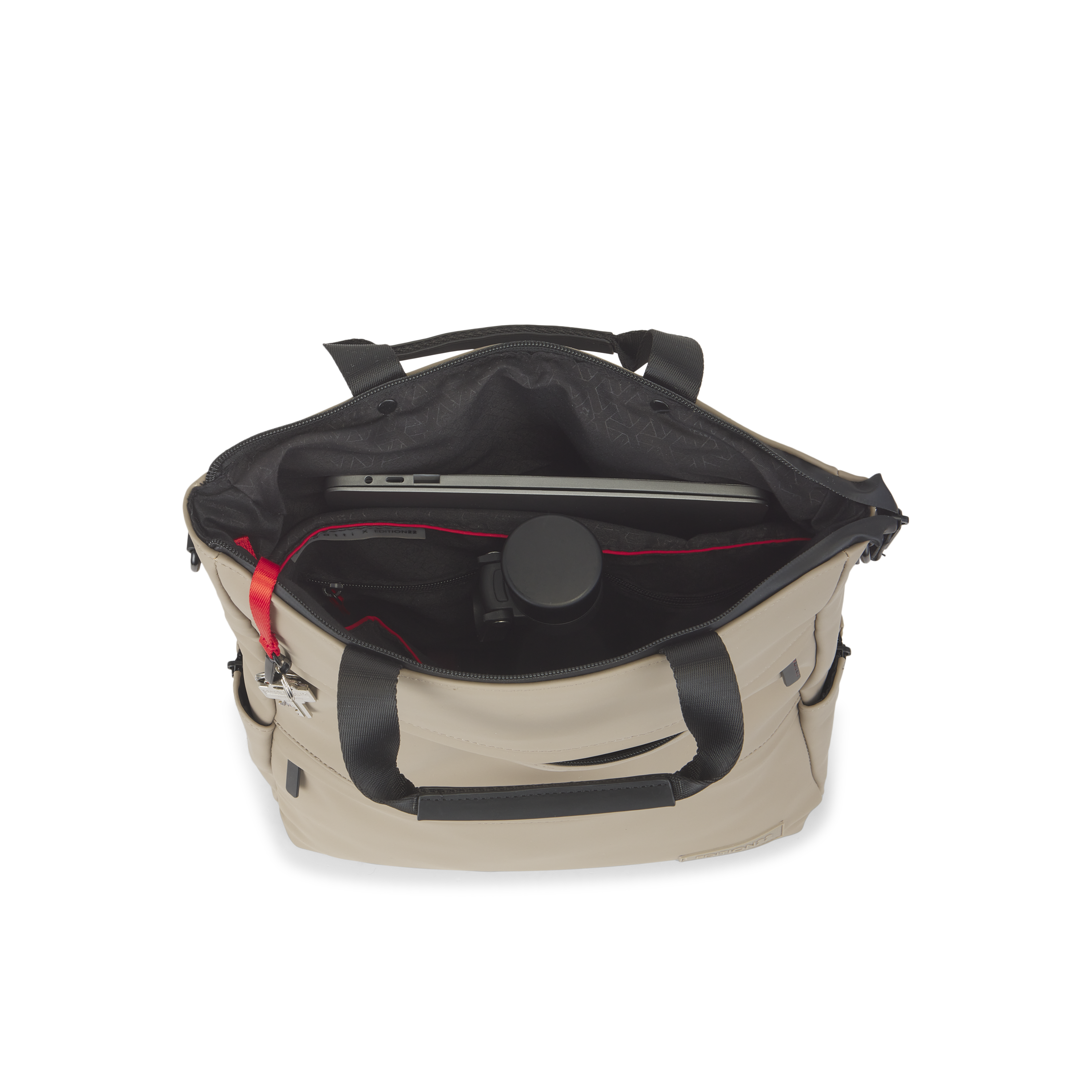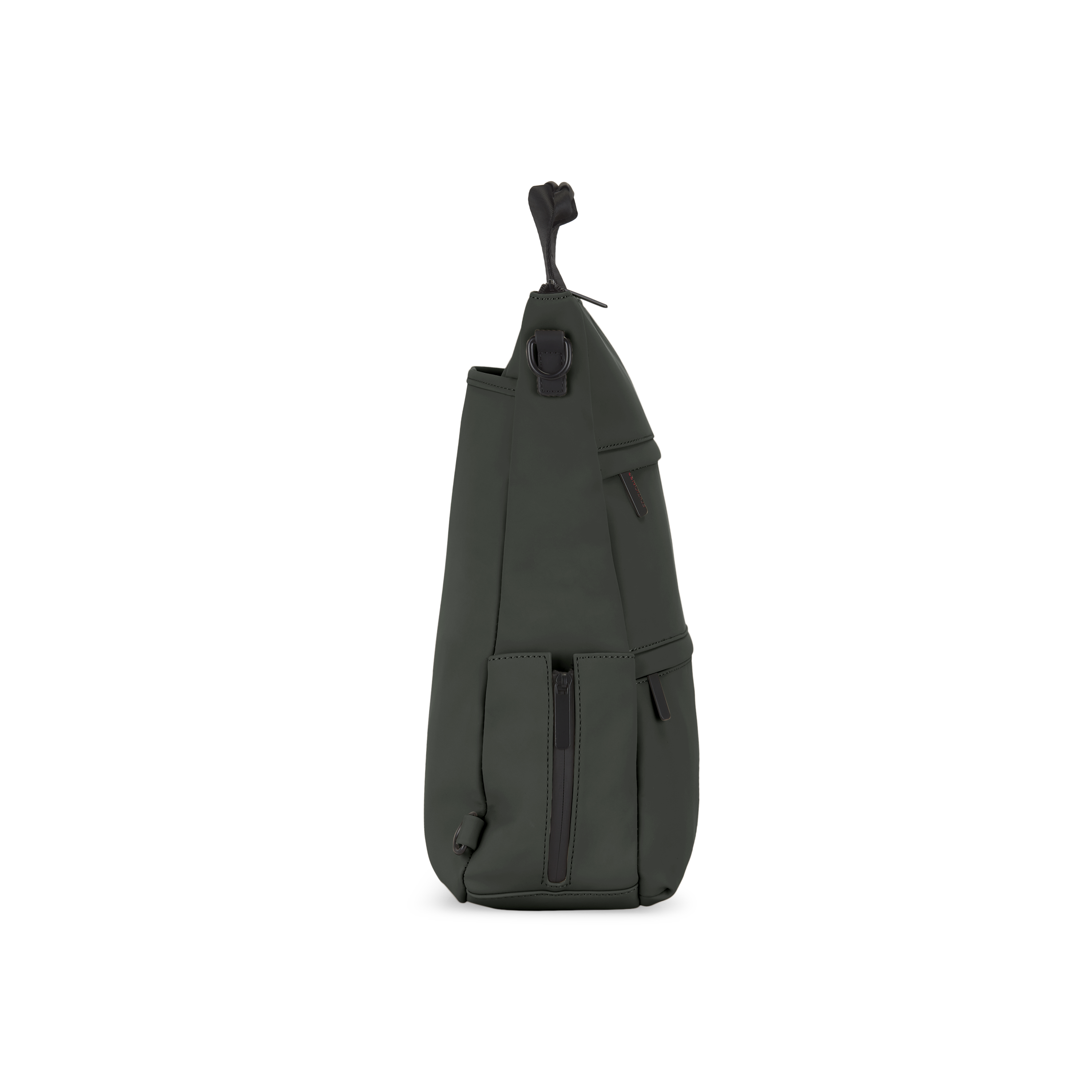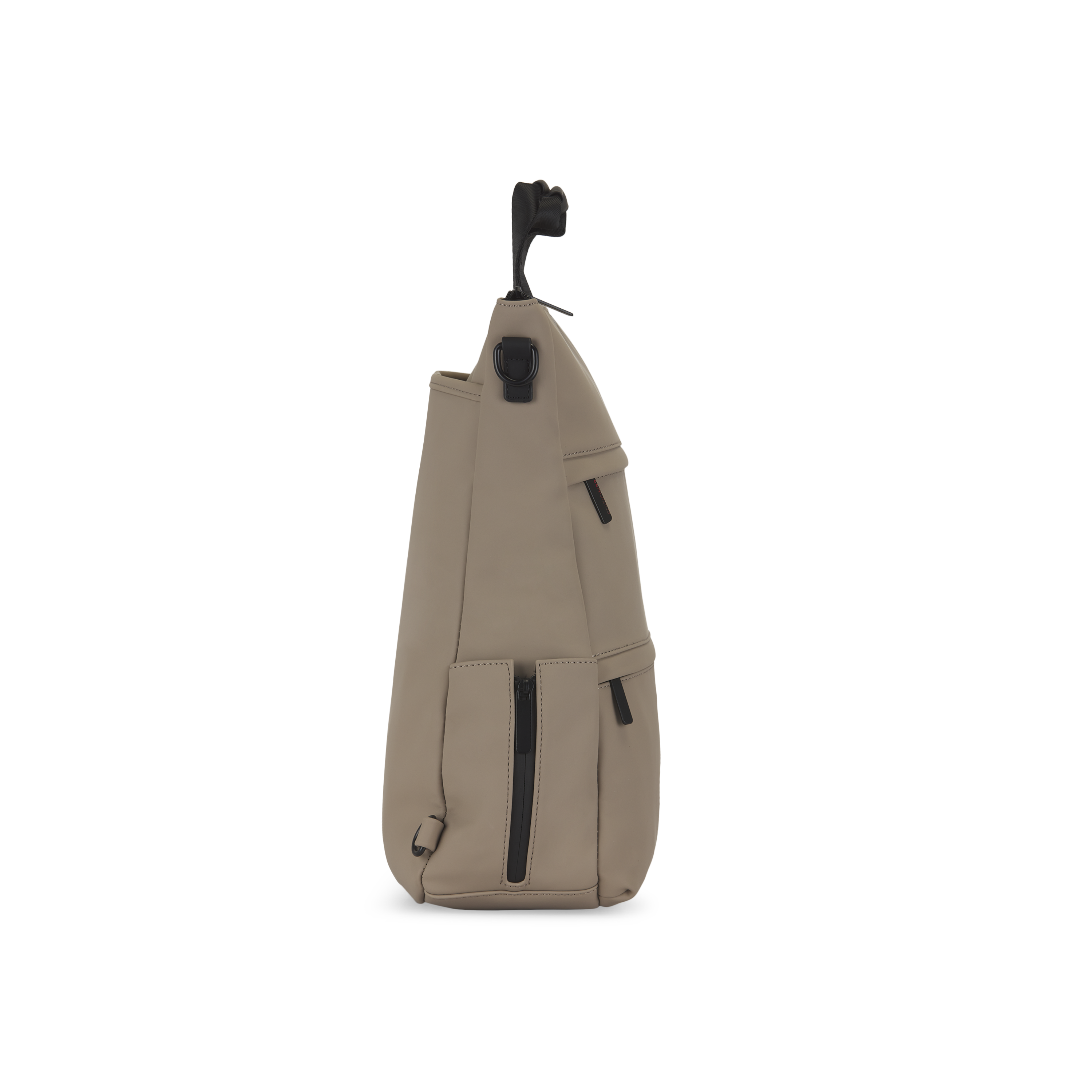 The Nomadic Tote is a stylish and versatile bag designed for individuals on the go. It is made with weather-resistant rubberized vegan leather, ensuring durability and protection against various weather conditions.