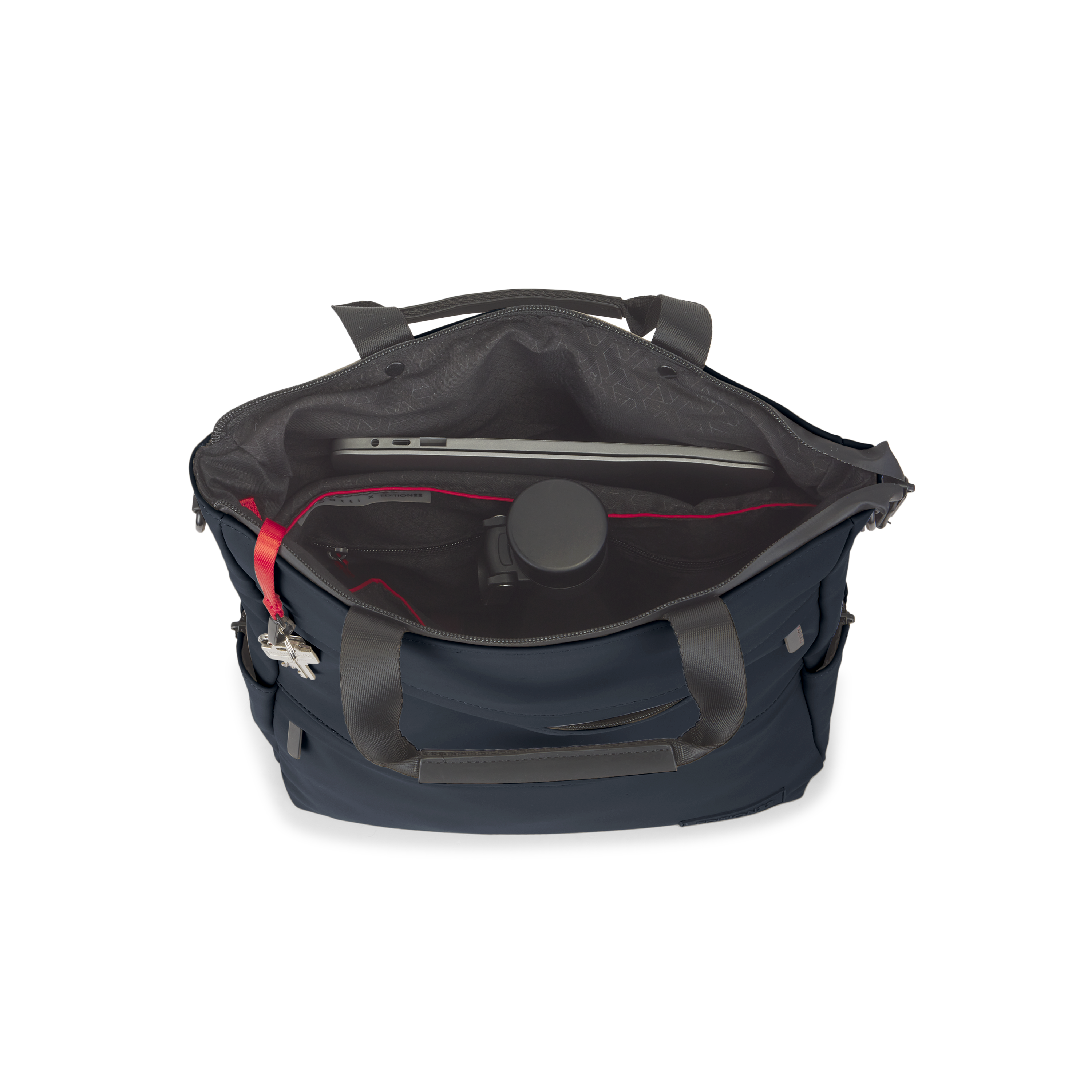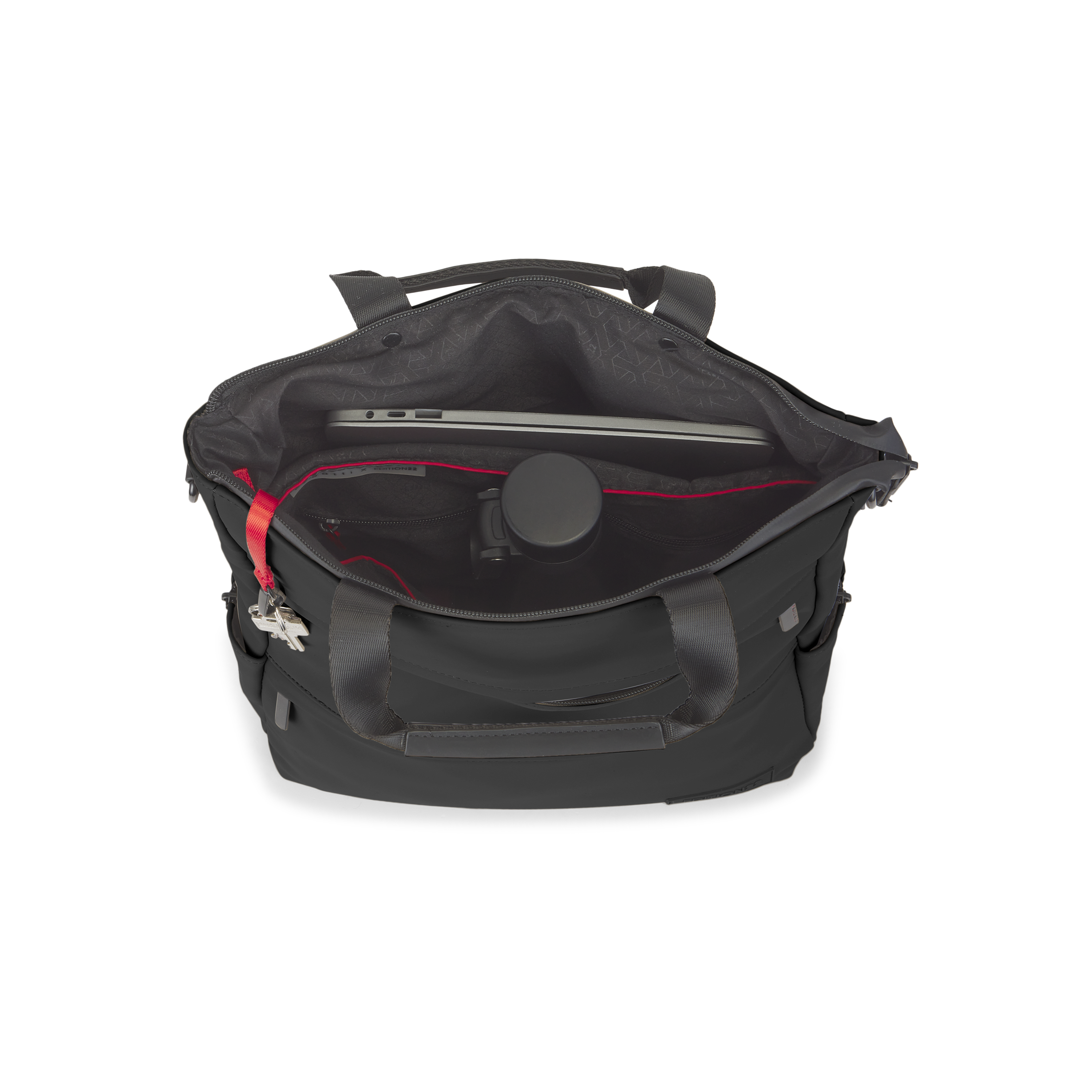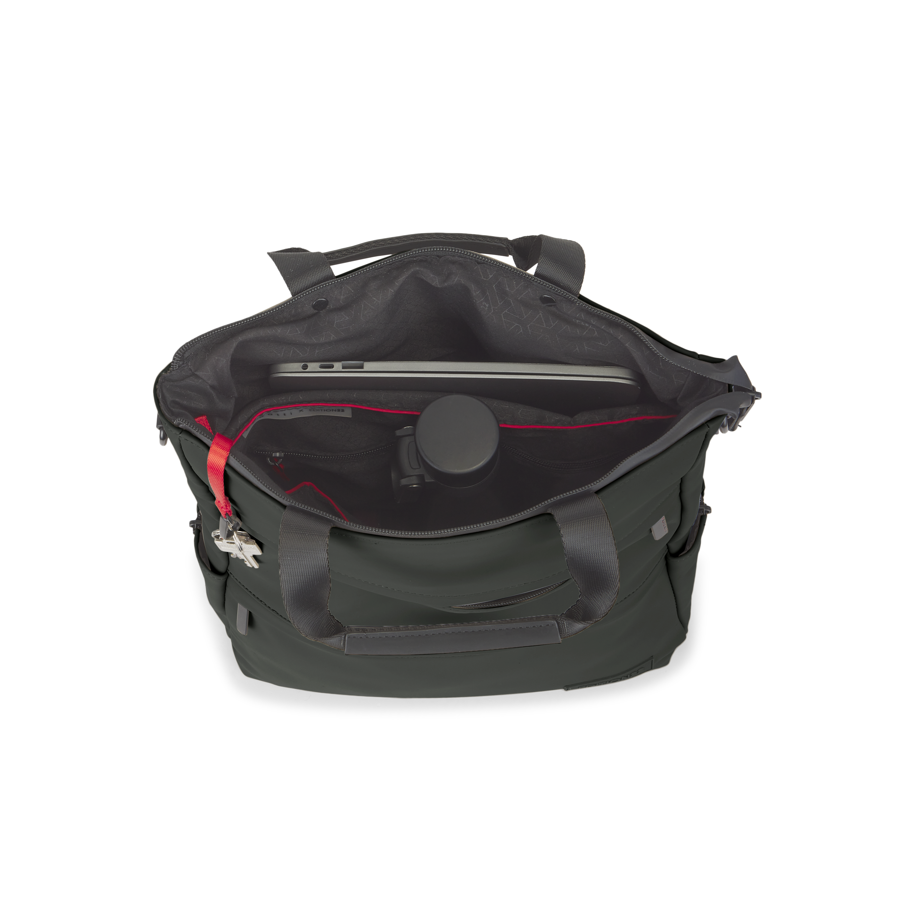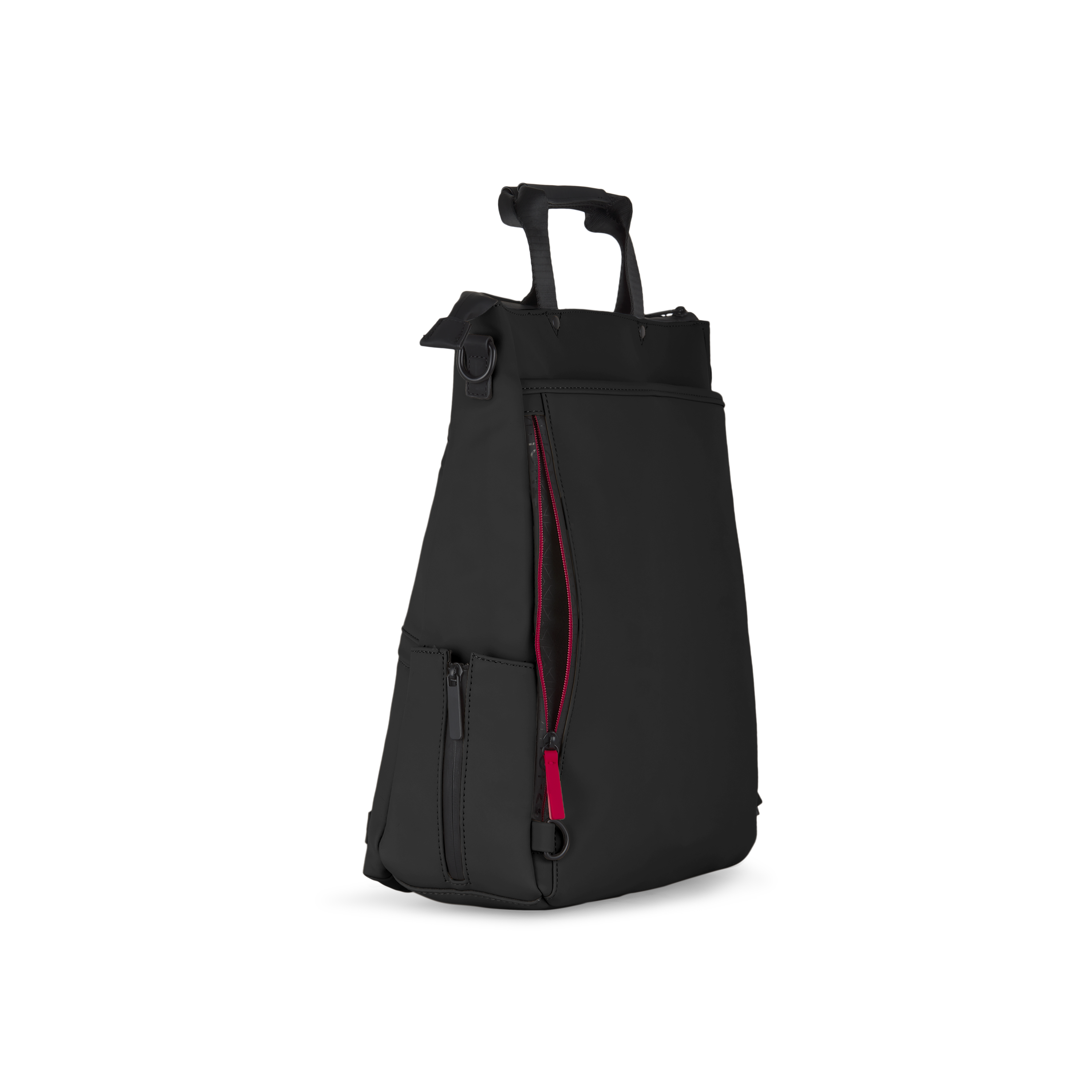 The Nomadic Tote is a stylish and versatile bag designed for individuals on the go. It is made with weather-resistant rubberized vegan leather, ensuring durability and protection against various weather conditions.